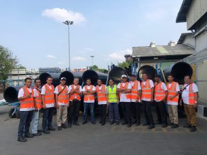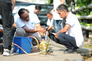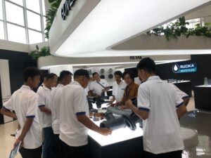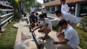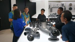 Selain itu, peserta juga melakukan praktik deteksi kebocoran dan commissioning jaringan perpipaan untuk memastikan sistem dapat beroperasi dengan baik sebelum digunakan. Peserta juga diajak mengunjungi fasilitas produksi pipa PE, laboratorium pengujian kualitas, serta showroom produk di Gedung Rucika Institute. Kegiatan ini memberikan pemahaman menyeluruh mengenai proses produksi, pengujian kualitas, hingga implementasi di lapangan.